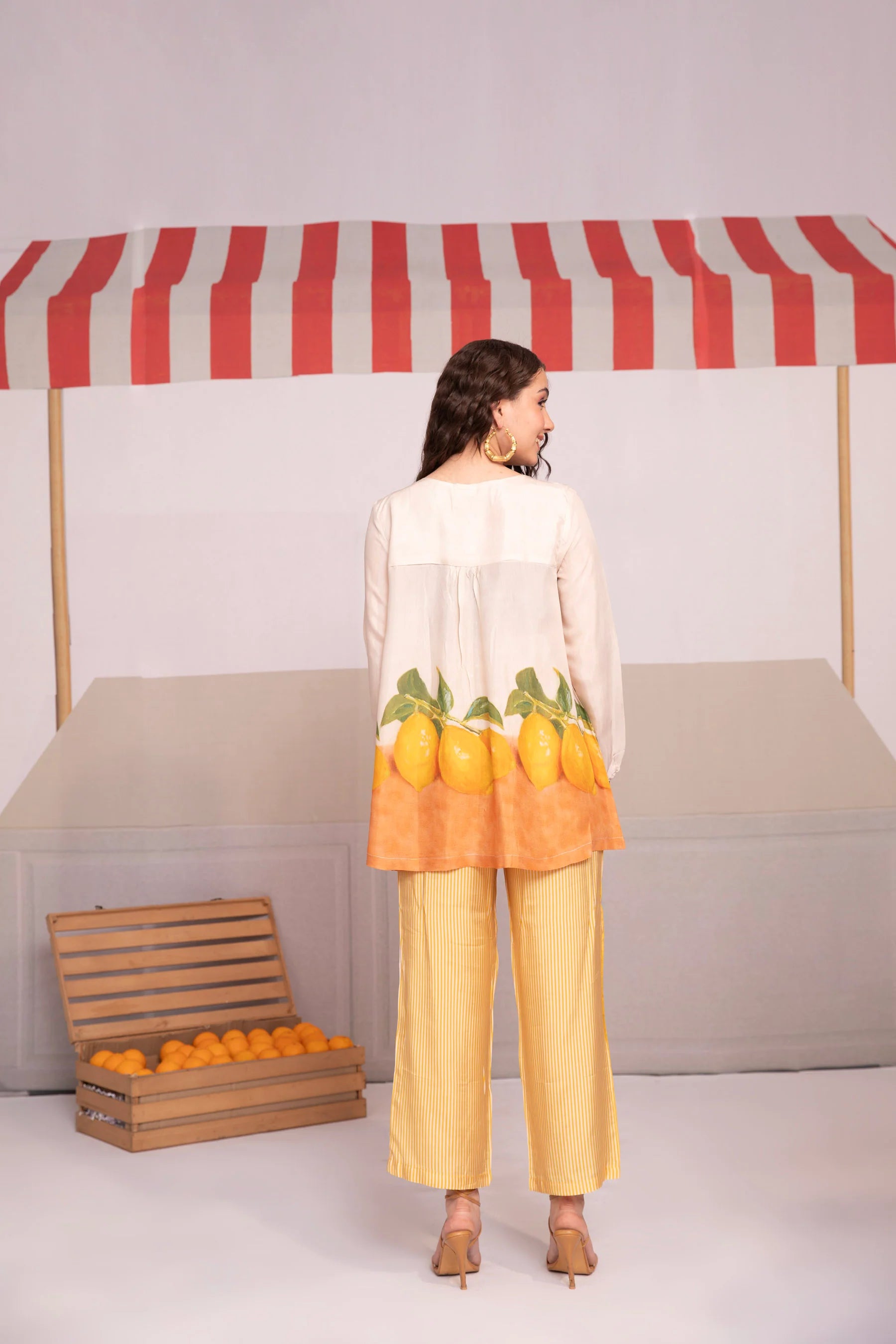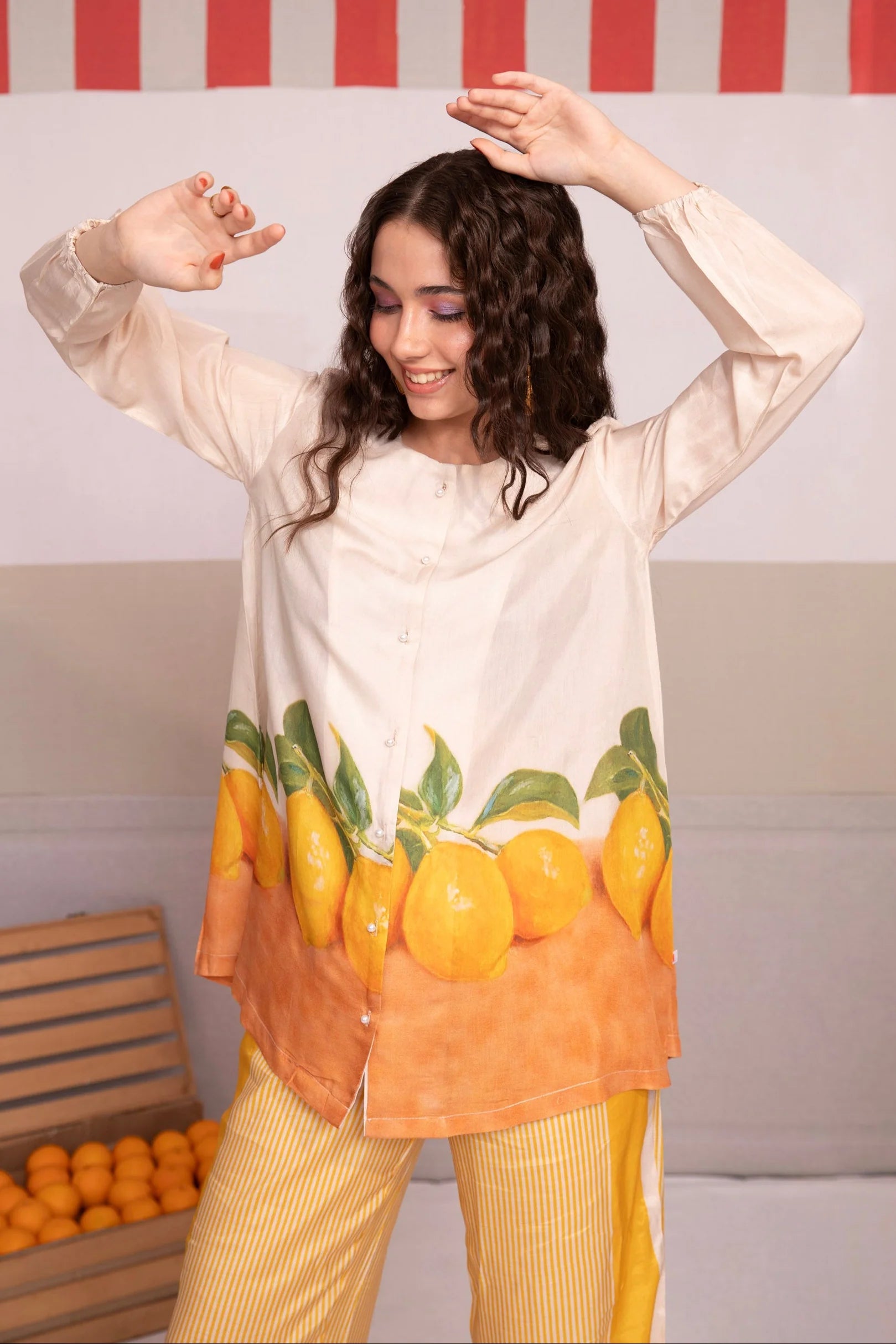 Fresh, playful, and effortlessly stylish — this beige and yellow co-ord set features whimsical orange fruit prints on luxuriously soft muslin fabric. Designed for comfort and ease, the relaxed silhouette fits like a dream, while the breathable texture keeps you cool all day long.