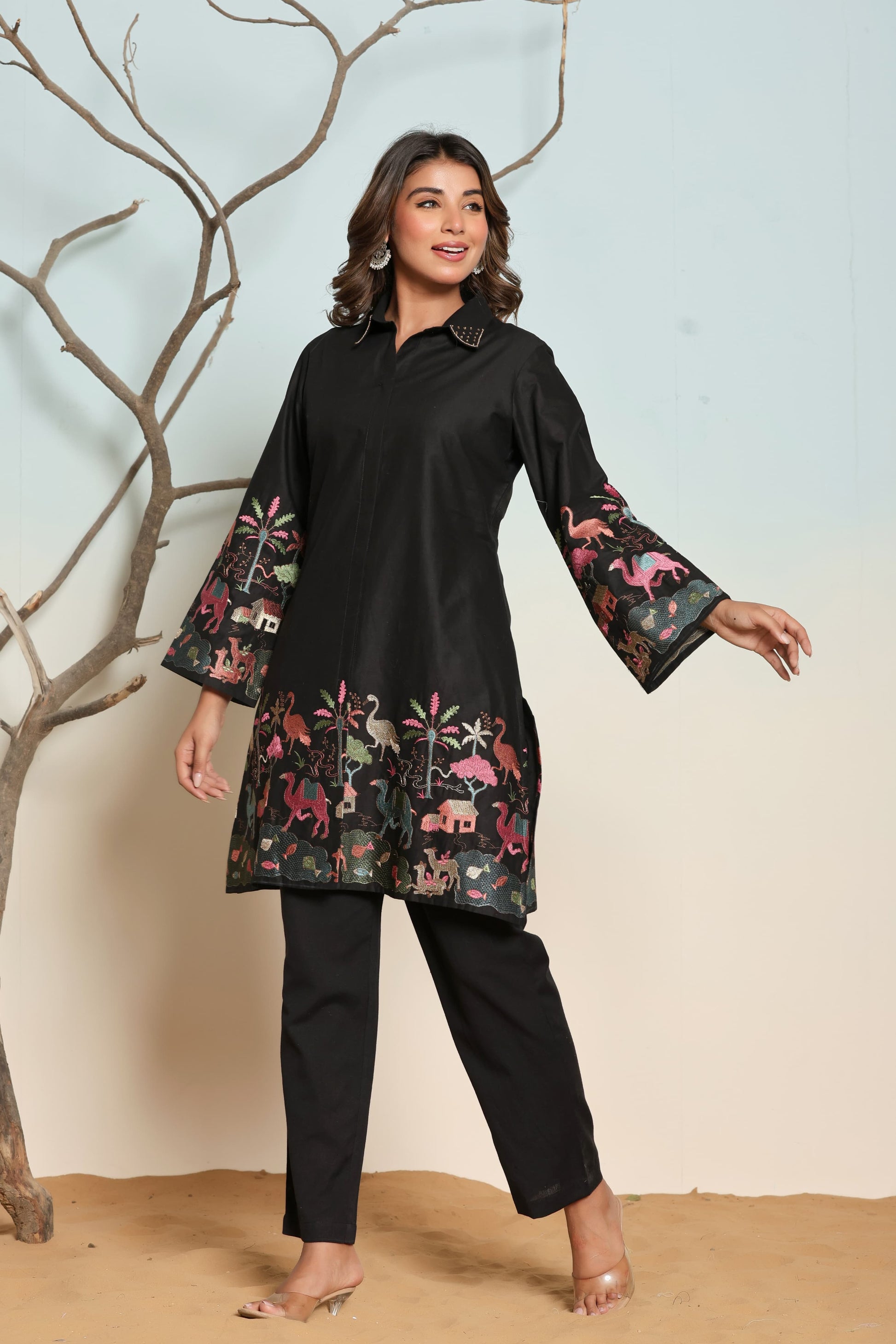 ✨ Elevate your ethnic wardrobe with this Women’s Black Cotton Embroidered Kurti & Pant Set. 🌸 Featuring a classic spread collar, full sleeves, and delicate embroidery, it beautifully blends timeless elegance with modern comfort.